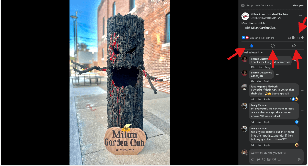 Every Comment, Reaction and Share of Milan Garden Club’s Scarecrow on the Milan Historical Society’s Facebook page counts as a vote for the Garden Club.